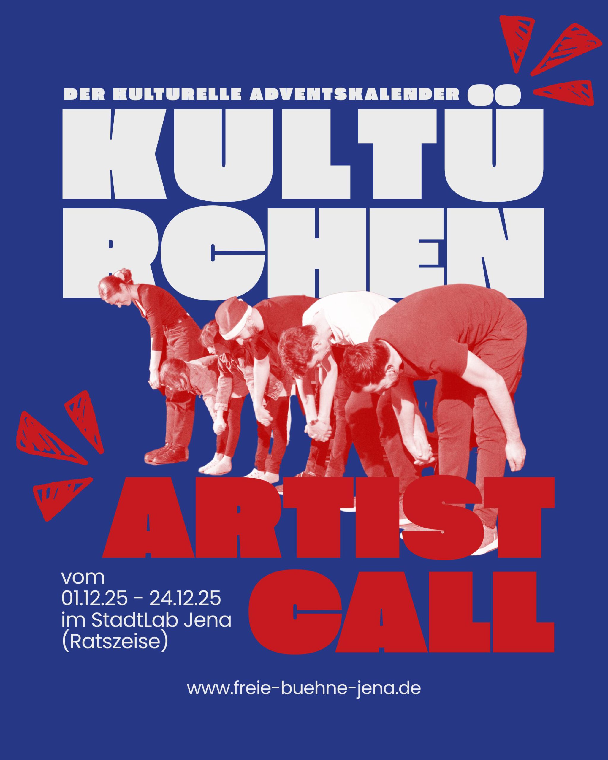 Der Kulturelle Adventskalender vom 01. bis 24.12.Das Kultürchen ist der kulturelle Adventskalender der Freien Bühne Jena. Jeden Abend im Dezember öffnen wir ein bis zweimal den Vorhang für kulturelle Überraschungs-Acts. Von Theater, über Musik und Zauberei bis hin zu Lesungen – jeder Abend bringt euch ein neues Highlight, das euch die Weihnachtszeit versüßt.